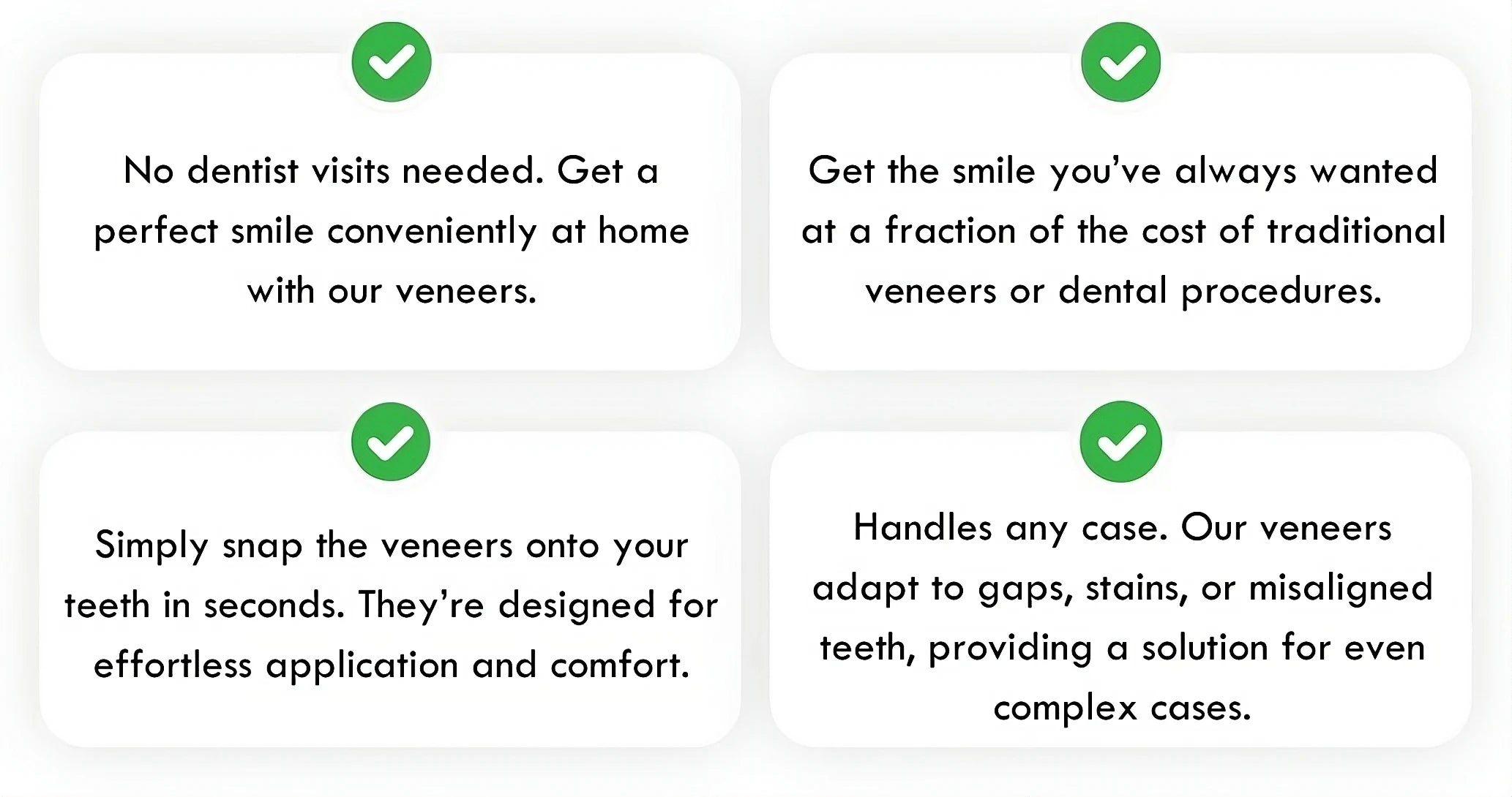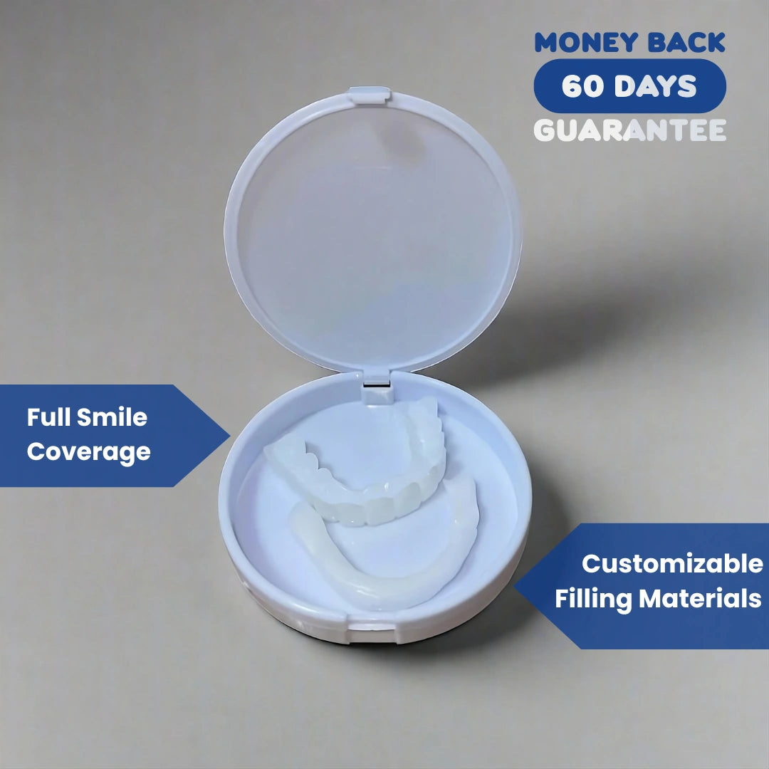 • Custom Fit: The veneers are moldable and adjustable, ensuring they conform to your teeth for a comfortable and secure fit.